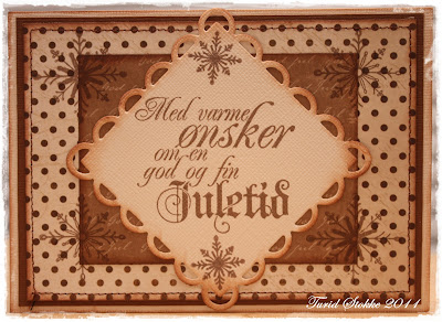 Jeg fant et brunprikkete papir fra My Mind's Eye som kunne kombineres med julepapir fra Papirdesign som jeg hadde litt av.... Men ble det nok? Etter litt tenking ble det ikke 6x6 inch julekort, men i kort i "vanlig" størrelse 11x15 cm, og da ordnet det seg.